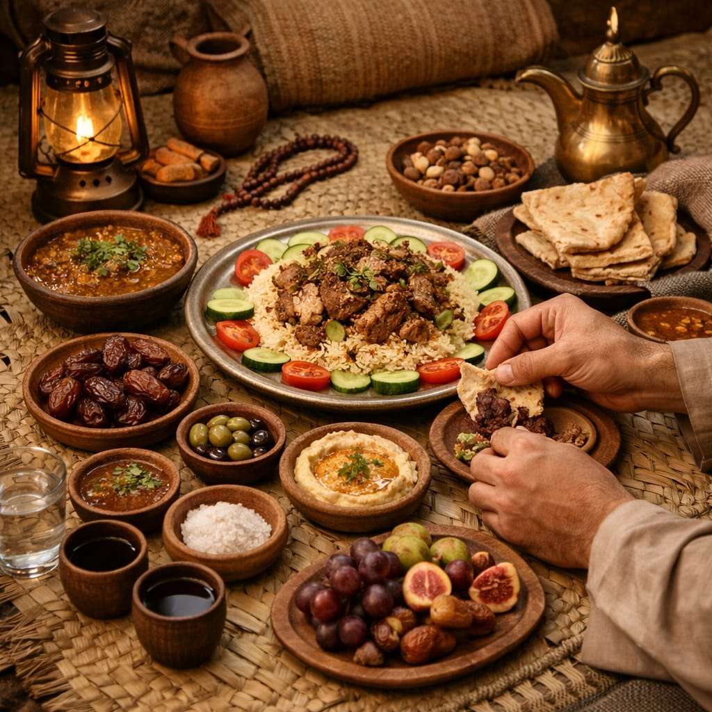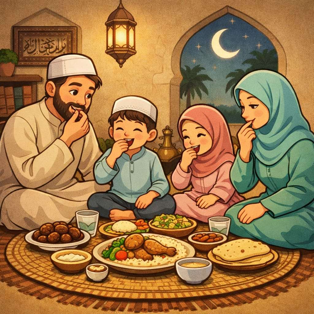 • Sitting together while eating in one place if possible, as sharing brings barakah.